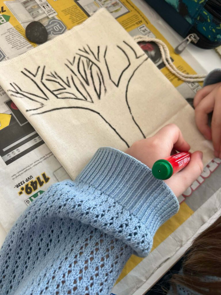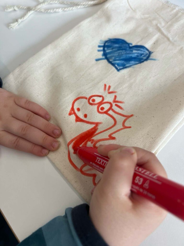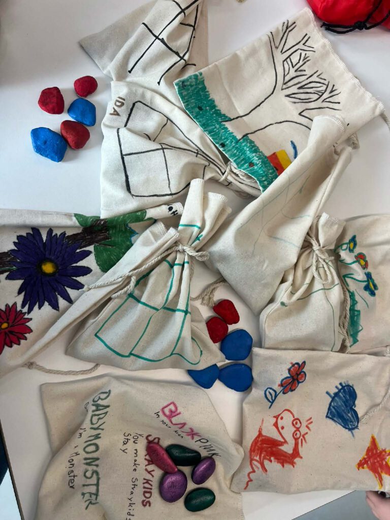 Als allererstes wurden von uns, von Maren selbst genähte, Stoffbeutel bemalt. Es kamen ganz viele tolle Designs zusammen. Ein paar Kinder haben Spiele wie Tik Tak To darauf gemalt, aber auch ganze „Gemälde“ sind entstanden und ein K-Pop Beutel. Zu den Beuteln haben wir auch Steine gesammelt und bemalt. Hier könnt ihr die ganzen Beutel+ Steine sehen und den Prozess: